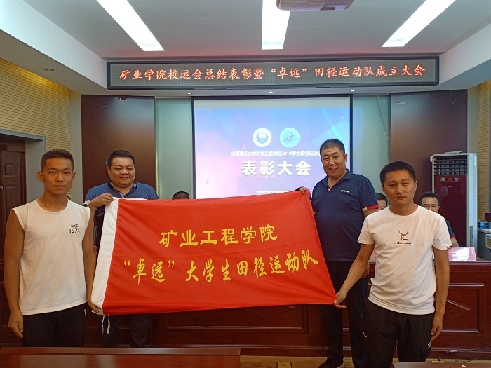 2019年6月3日中午12:30,9778818威尼斯2019年校运会总结表彰暨“卓远”田径运动队成立大会在采矿楼二层会议室隆重召开。山西春城煤矿勘察设计有限公司董事长王琳、山西春城煤矿勘察设计有限公司总经理李䶮、太原卓远文化传播有限公司总经理徐连、学院党委书记薛武杰、党委副书记武佐君,学工办主任刘宏伟、院团委书记张丁香、各辅导员、全体2019年校运会运动员、教练员、各志愿者代表参加会议,会议由党委副书记武佐君主持。